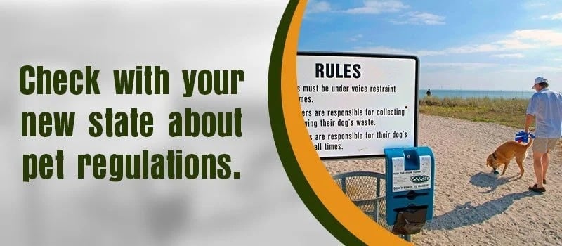 Before moving to a new state/province with your pet, keep in mind the local leash laws, pet ordinances, and pet licensing requirements. You may visit the website of the U.S. Department of Agriculture or the State Veterinarian's office in your destination state if you have any questions and to get more details on how to coordinate the move for your pet. For local ordinances, you can also contact the City Clerk’s office, local organizations, or animal control facility in the area where you’ll be moving.